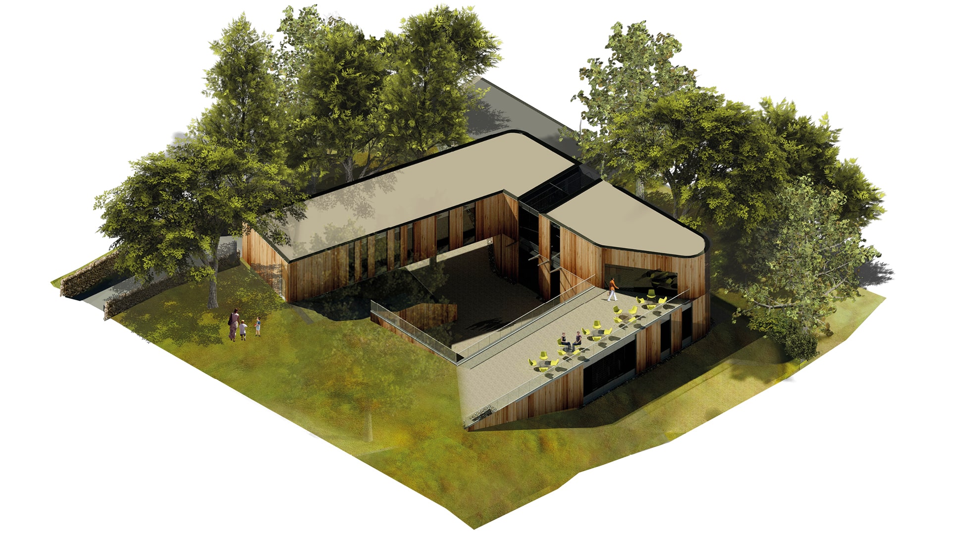 An isometric view of the scheme. Created using Revit and Photoshop.